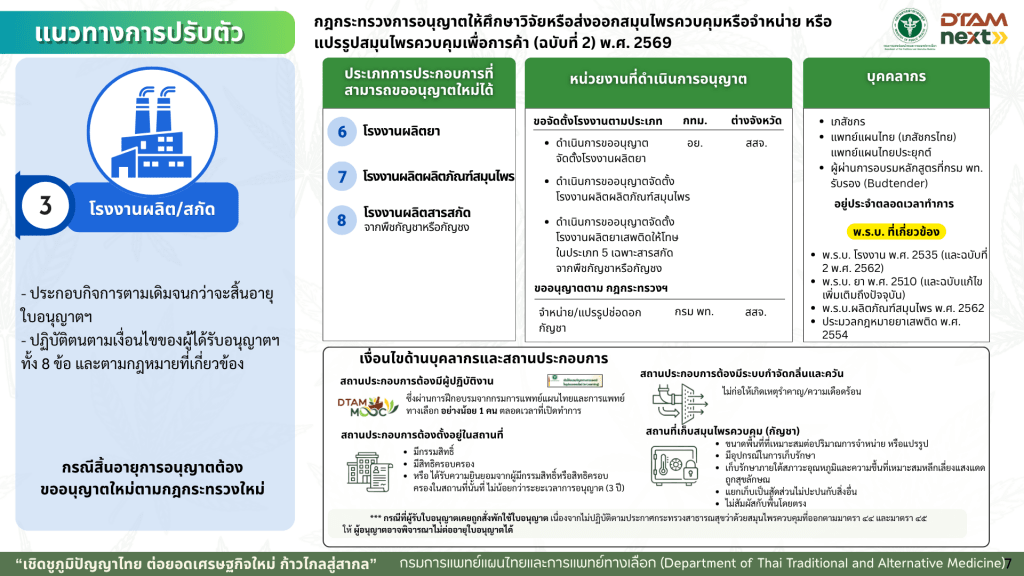 ดังนั้น การที่โรงงานจะนำ “ช่อดอกกัญชา” มาแปรรูปนั้น จะต้องอยู่ภายใต้กฎกระทรวงการอนุญาตให้ศึกษาวิจัยหรือส่งออกสมุนไพรควบคุม หรือจำหน่าย หรือแปรรูปสมุนไพรควบคุมเพื่อการค้า (ฉบับที่ 2) พ.ศ. 2569 ซึ่งโรงงานต้องมา ขออนุญาตจำหน่าย/แปรรูปช่อดอกกัญชา กับทางกรม พท. หรือ สสจ. ด้วย เพื่อให้หน่วยงานสามารถตรวจสอบย้อนกลับแหล่งที่มาและการนำไปใช้ของช่อดอกกัญชาได้