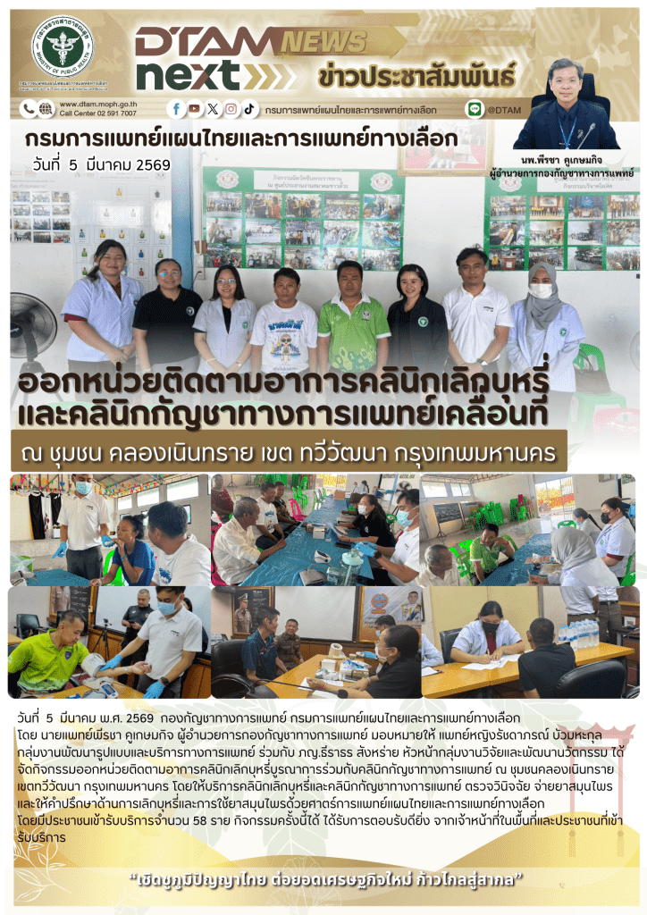 เมื่อวันที่ 5 มีนาคม พ.ศ. 2569 กองกัญชากางการแพทย์ กรมการแพทย์แผนไทยและการแพทย์ทางเลือก โดยนายแพทย์พีรชา คูเกษมกิจ ผู้อำนวยการกองกัญบาทางการแพทย์ มอบหมายให้ แพทย์หญิงรัชดาภาภรณ์ บ้วมหะกุล กลุ่มงานพัฒนารูปแบบและบริการการการแพทย์ ร่วมกับ ภญ.ธีราธร สังหร่าย หัวหน้ากลุ่มงานวิจัยและพัฒนานวัตกรรม ได้จัดกิจกรรมออกหน่วยติดตามอาการคลินิกเลิกบุหรี่บูรณาการร่วมกับคลินิกกัญชาทางการแพทย์ ณ ชุมชนคลองเนินทราย เขตทวีวัฒนา กรุงเทพมหานคร โดยให้บริการคลินิกเลิกบหรี่และคลินิกกัญชาทางการแพทย์ ตรวจวววินิจฉัย จ่ายยาสมุนไพรและให้ค่ำปรึกษาด้านการเลิกบหรี่และการใช้ยาสบบไพรด้วยศาตร์การแพทย์แผมไทยและการแพทย์ทางเลือกโดยมีประชาชนเข้ารับบริการจำนวน 58 ราย กิจกรรมครั้งนี้ได้ ได้รับการตอบรับดียิ่ง จากเจ้าหน้าที่ในพื้นที่และประชาชนที่เข้ารับบริการ