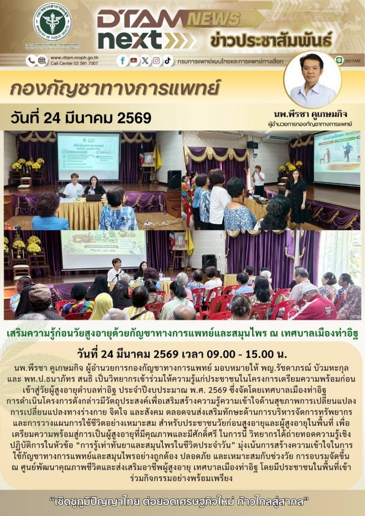เมื่อวันที่ 24 มีนาคม 2569 เวลา 09.00 – 15.00 น. นายแพทย์พีรชา คูเกษมกิจ ผู้อำนวยการกองกัญชาทางการแพทย์ มอบหมายให้ แพทย์หญิง รัชดาภรณ์ บัวมหะกุล และ พท.ป.ธนาภัทร สนธิ เป็นวิทยากรเข้าร่วมให้ความรู้แก่ประชาชนในโครงการเตรียมความพร้อมก่อน เข้าสู้วัยผู้สูงอายุตำบลท่าอิฐ ประจำปีงบประมาณ พ.ศ. 2569 ซึ่งจัดโดยเทศบาลเมืองท่าอิฐ การดำเนินโครงการดังกล่าวมีวัตถุประสงค์เพื่อเสริมสร้างความรู้ความเข้าใจด้านสุขภาพการเปลี่ยนแปลง การเปลี่ยนแปลงทางร่างกาย จิตใจ และสังคม ตลอดจนส่งเสริมทักษะด้านการบริหารจัดการทรัพยากรและการวางแผนการใช้ชีวิตอย่างเหมาะสม สำหรับประชาชนวัยก่อนสูงอายุและผู้สูงอายุในพื้นที่ เพื่อเตรียมความพร้อมสู่การเป็นผู้สูงอายุที่มีคุณภาพและมีศักดิ์ศรี ในการนี้ วิทยากรได้ถ่ายทอดความรู้เชิงปฎิบัติการในห้อข้อ การรู้เท่าทันยาและสมุนไพรในชีวิตประจำวัน มุ่งเนินการสร้างความเข้าใจในการใช้กัญชาทางการแพทย์และสมุนไพรอย่างถูกต้อง ปลอดภัย และเหมาะสมกับช่วงวัย การอบรมจัดขึ้น ณ ศูนย์พัฒนาคุณภาพชีวิตและส่งเสริมอาชีพผู้สูงอายุ เทศบาลเมืองท่าอิฐ โดยมีประชาชนในพื้นที่เข้าร่วมกิจกรรมอย่างพร้อมเพรียง