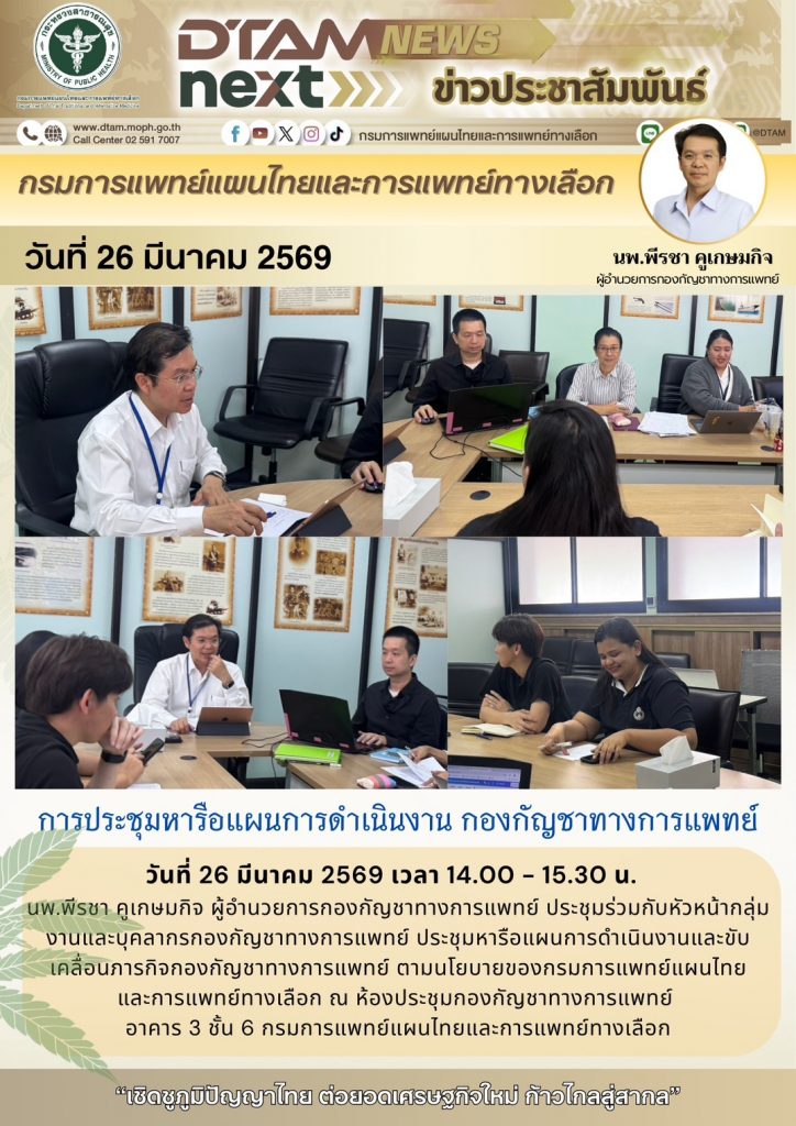 เมื่อวันที่ 24 มีนาคม 2569 เวลา 14.00 – 15.30 น. นายแพทย์พีรชา คูเกษมกิจ ผู้อำนวยการกองกัญชาทางการแพทย์ ประชุมร่วมกับหัวหน้ากลุ่มงานและบุคลากรกองกัญชาทางการแพทย์ ประชุมหารือแผนการดำเนินงานและขับเคลื่อนภารกิจกองกัญชาทางการแพทย์ ตามนโยบายของกรมการแพทย์แผนไทยและการแพทย์ทางเลือก ณ ห้องประชุมกองกัญชาทางการแพทย์ อาคาร 3 ชั้น 6 กรมการแพทย์แผนไทยและการแพทย์ทางเลือก