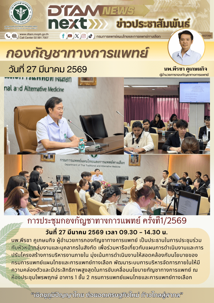 เมื่อวันที่ 27 มีนาคม 2569 เวลา 09.30 – 14.30 น. นายแพทย์พีรชา คูเกษมกิจ ผู้อำนวยการกองกัญชาทางการแพทย์ เป็นประธานในการประชุมร่วมกับหัวหน้ากลุ่มงานและบุคลากรในสังกัด เพื่อร่วมหารือเกี่ยวก้บแผนการดำเนินงานและการปรับโครงสร้างการบริหารงานภายใน มุ่งเน้นการดำเนินงานให้สอดคล้องกับนโยบายของกรมการแพทย์แผนไทยและการแพทย์ทางเลือก พัฒนาระบบการบริหารจัดการภายในให้มีความคล่องตัวและมีประสิทธิภาพสูงสุดในการขับเคลื่อนนโยบายกัญชาทางการแพทย์ ณ ห้องประชุมไพรพฤกษ์ อาคาร 1 ชั้น 2 กรมการแพทย์แผนไทยและการแพทย์ทางเลือก