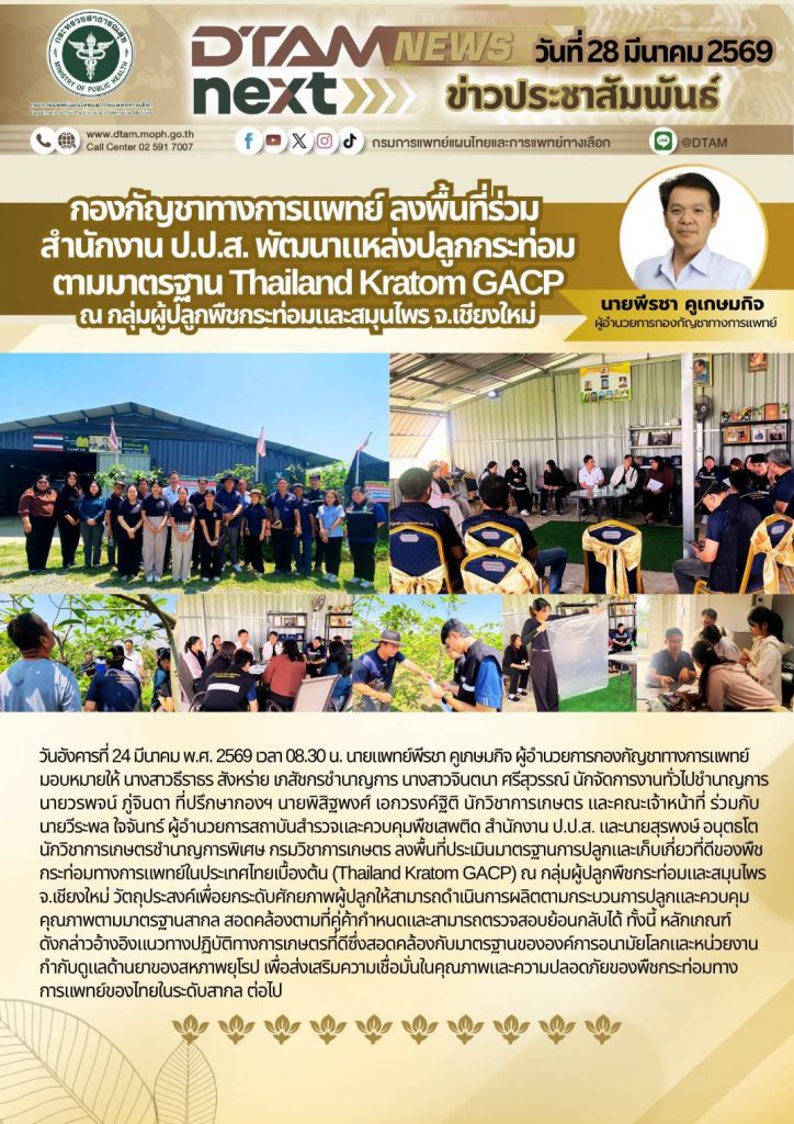 เมื่อวันที่ 24 มีนาคม 2569 เวลา 08.30 น. นายแพทย์พีรชา คูเกษมกิจ ผู้อำนวยการกองกัญชาทางการแพทย์ มอบหมายให้ นางสาวธีราธร สังหร่าย เภสัชกรชำนาญการ นางสาวจินตนา ศรีสุวรรณ์ นักจัดการงานทั่วไปชำนาญการ นายวรพจน์ ภู่จินดา ที่ปรึกษากองฯ นายพิสิฐพงศ์ เอกวรงค์ฐิติ นักวิชาการเกษตร และคณะเจ้าหน้าที่ ร่วมกับ นายวีระพล ภู่จินดา ผู้อำนวยการสถาบันสำรวจและควบคุมพืชเสพติด สำนักงาน ป.ป.ส. และนายสุรพงษ์ อนุตรโต นักวิชาการเกษตรชำนาญการพิเศษ กรมวิชาการเกษตร ลงพื้นที่ประเมินมาตรฐานการปลูกและเก็บเกี่ยวที่ดีของพืชกระท่อมทางการแพทย์ในประเทศไทยเบื้องต้น (Thailand Kratom GACP) ณ กลุ่มผู้ปลูกพืชกระท่อมและสมุนไพร จ.เชียงใหม่ วัตถุประสงค์เพื่อยกระดับศักยภาพผู้ปลูกให้สามารถดำเนินกการผลิตตามกระบวนการปลูกและควบคุมคุณภาพตามมาตรฐานสากล สอดคล้องตามที่คู่ค้ากำหนดและสามารถตรวจสอบย้อนกลับได้ ทั้งนี้ หลักเกณฑ์ ดังกล่าวอ้าวอิงแนวทางปฎิบัติทางการเกษตรที่ดีซึ่งสอดคล้องกับมาตรฐานขององค์การอนามัยโลกและหน่วยงานกำกับดูแลด้านยาของสหภาพยุโรป เพื่อส่งเสริมความเชื่อมั่นในคุณภาพและความปลอดภัยของพืชกระท่อมทางการแพทย์ของไทยในระดับสากล ต่อไป