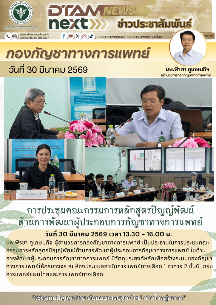 เมื่อวันที่ 30 มีนาคม 2569 เวลา 13.30-16.00น. นายแพทย์พีรชา คูเกษมกิจ ผู้อำนวยการกองกัญชาทางการแพทย์เป็นประธานในการประชุมคณะกรรมการหลักสูตรปัญญ์พัฒน์ด้านการพัฒนาผู้ประกอบการกัญชาทางการแพทย์ ในด้านการพัฒนาผู้ประกอบการกัญชาทางการแพทย์ มีวัตถุประสงค์หลักเพื่อสร้างระบบของกัญชาทางการแพทย์ให้ครบวงจร ณ ห้องประชุมสถาบันการแพทย์ทางเลือก 1 อาคาร 2 ชั้น 6 กรมการแพทย์แผนไทยและการแพทย์ทางเลือก