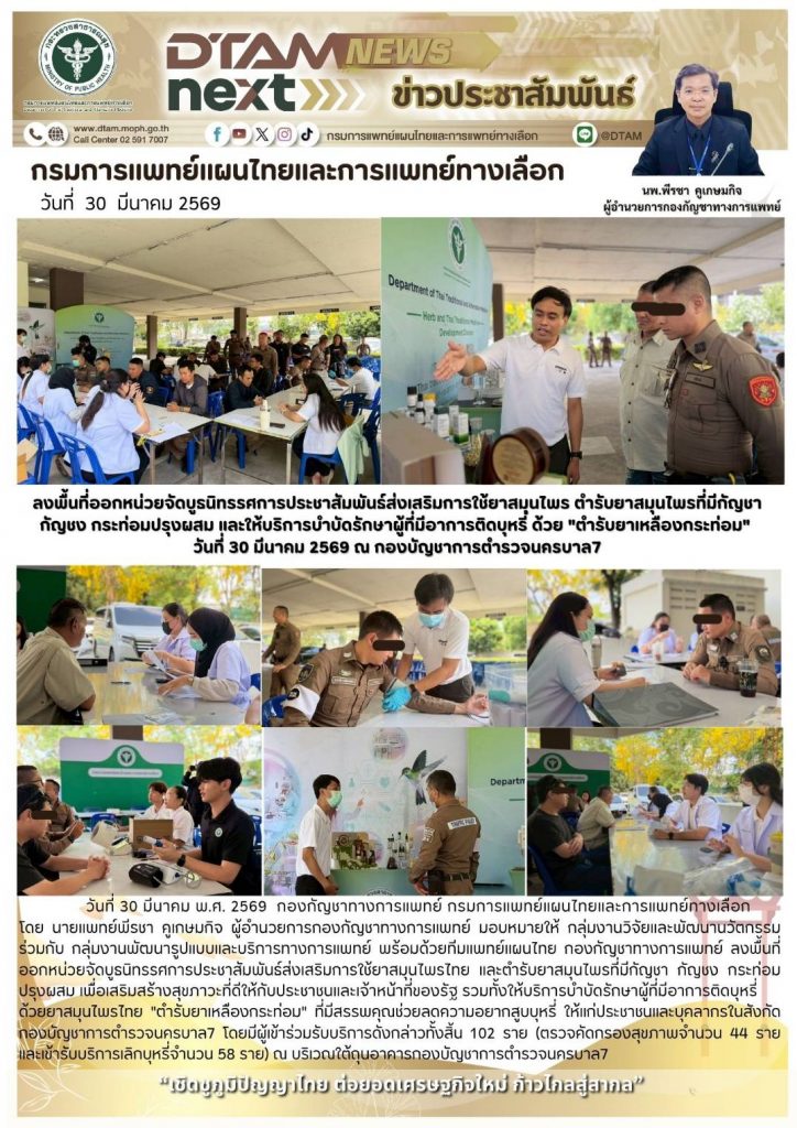 เมื่อวันที่ 30 มีนาคม 2569 กองกัญชาทางการแพทย์ กรมการแพทย์แผนไทยและแพทย์ทางเลือก โดย นายแพทย์พีรชา คูเกษมกิจ ผู้อำนวยการกองกัญชาทางการแพทย์ มอบหมายให้ กลุ่มงานวิจัยและพัฒนานวัตกรรม ร่วมกับ กลุ่มงานพัฒนารูปแบบและบริการทางการแพทย์ พร้อมด้วยทีมแพทย์แผนไทย กองกัญชาทางการแพทย์ ลงพื้นที่ออกหน่วยจัดบูรนิทรรศการประชาสัมพันธ์ส่งเสริมการใช้ยาสมุนไพรไทยและตำรับยาสมุนไพรที่มีกัญชา กัญชง กระท่อม ปรุงผสม เพื่อเสริมสร้างสุขภาวะที่ดีใชห้กับประชาชนและเจ้าหน้าที่ของรัฐ รวมทั้งให้บริการบำบัดรักษาผู้ที่มีอาการติดบุหรี่ด้วยยาสมุนไพรไทย ตำรับยาเหลืองกระท่อม ที่มีสรรพคุณช่วยลดความสูบบุหรี่ ให้แก่ประชาชนและบุคลากรในสังกัด กองบัญชาการตำรวจนครบาล 7 โดยมีผู้เข้าร่วมรับบริการดังกล่าวทั้งสิ้น 102 ราย (ตรวจคัดกรองสุขภาพจำนวน 44 ราย และเข้ารับบริการเลิกบุหรี่จำนวน 58 ราย) ณ บริเวณใต้ถุนอาคารกองกัญชาการตำรวจนครบาล 7