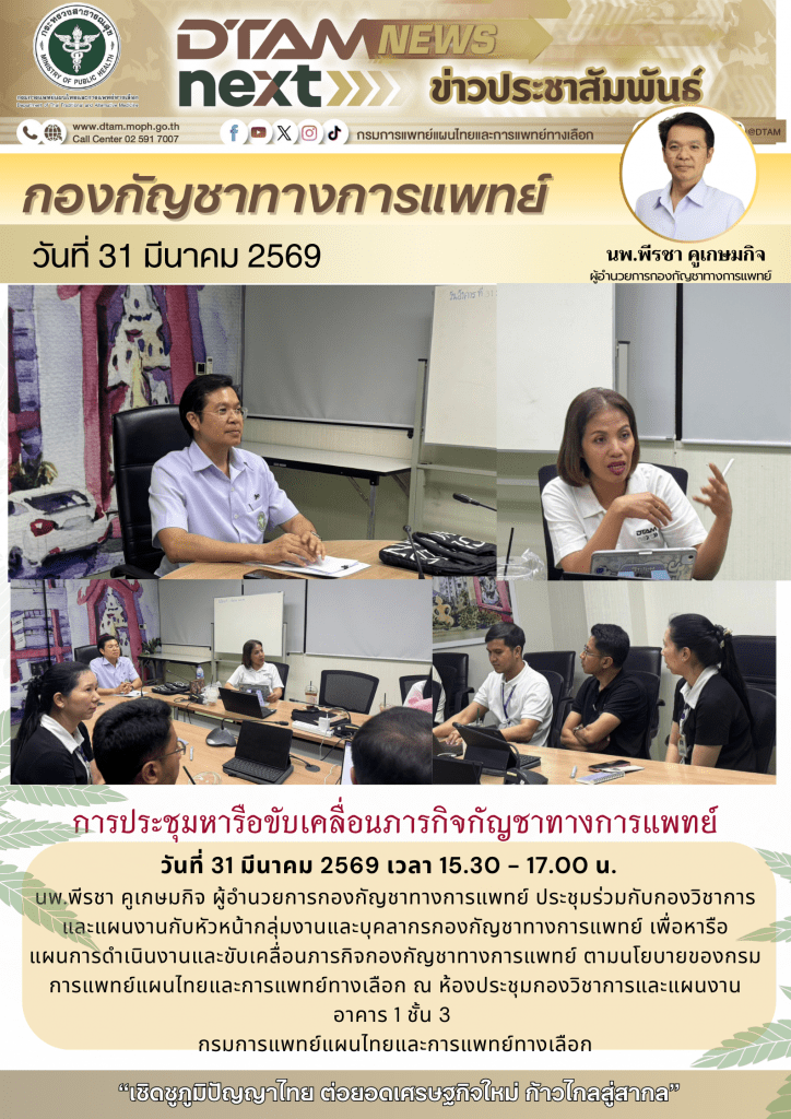 เมื่อวันที่ 31 มีนาคม 2569 เวลา15.30 – 17.00 น. นายแพทย์พีรชา คูเกษมกิจ ผู้อำนวยการกองกัญชาทางการแพทย์ประชุมร่วมกับกองวิชาการและแผนงานกับหัวหน้ากลุ่มงานและบุคลากรกองกัญชาทางการแพทย์ ตามนโยบายของกรมการแพทย์แผนไทยและการแพทย์ทางเลือก ณ ห้องประชุมกองวิชาการและแผนงาน อาคาร 1 ชั้น 3 กรมการแพทย์แผนไทยและการแพทย์ทางเลือก