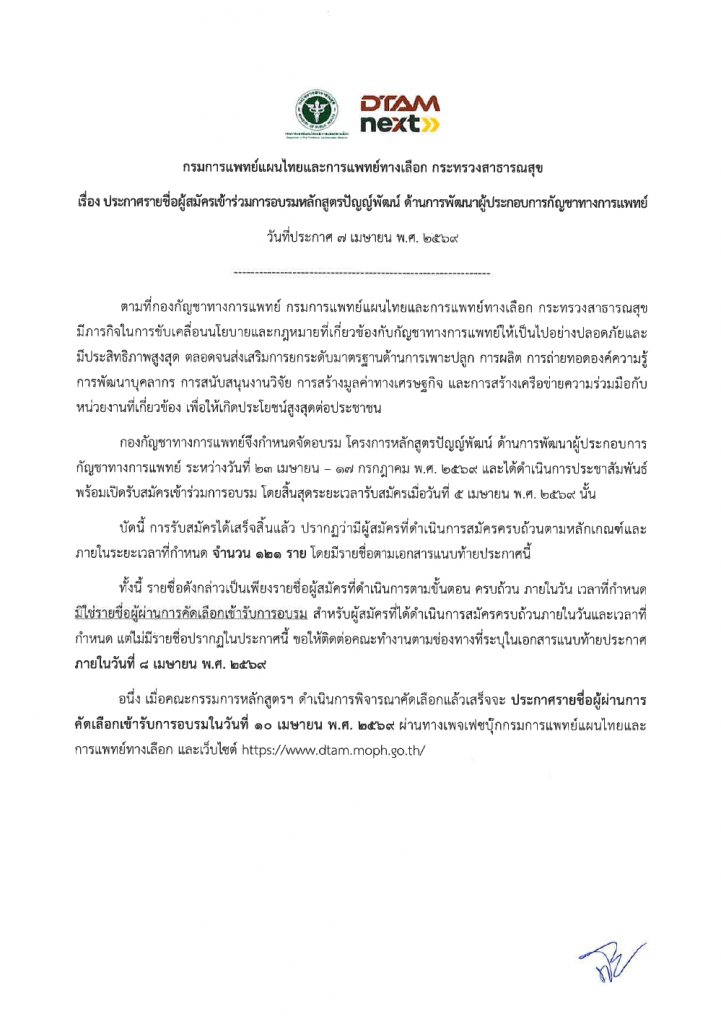 ประกาศรายชื่อผู้ผ่านการคัดเลือกวันที่ 10 เมษายน 2569 ผ่านทางเพจนี้ และเว็บไซต์ของกรมฯ