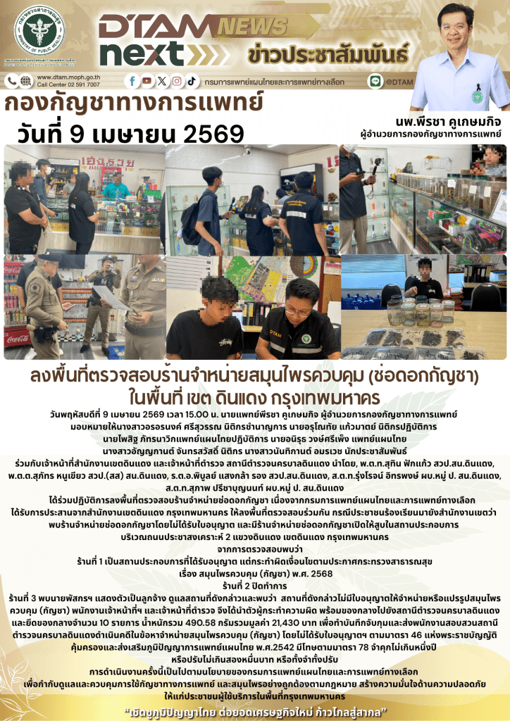 วันพฤหัสบดีที่ 9 เมษายน 2569 เวลา 15.00 น. นายแพทย์พีรชา คูเกษมกิจ ผู้อำนวยการกองกัญชาทางการแพทย์มอบหมายให้นางสาวอรอรนงค์ ศรีสุวรรณ นิติกรชำนาญการ นายอรุโณทัย แก้วมาตย์ นิติกรปฏิบัติการนายไพสิฐ ภัทรนาวิกแพทย์แผนไทยปฏิบัติการ นายอนิรุธ วงษ์ศรีเพ็ง แพทย์แผนไทย นางสาวอัญญกานต์ จันทรสวัสดิ์ นิติกร นางสาวนันทิกานต์ อมรเวช นักประชาสัมพันธ์ ร่วมกับเจ้าหน้าที่สำนักงานเขตดินแดง และเจ้าหน้าที่ตำรวจ สถานีตำรวจนครบาลดินแดง นำโดย, พ.ต.ท.สุทิน ฟักแก้ว สวป.สน.ดินแดง, พ.ต.ต.สุภัทร หนูเขียว สวป.(สส) สน.ดินแดง, ร.ต.อ.พิบูลย์ แสงกล้า รอง สวป.สน.ดินแดง, ส.ต.ท.รุ่งโรจน์ อิทรพงษ์ ผบ.หมู่ป.สน.ดินแดง,ส.ต.ท.สุภาพ ปรีชาบุญนนท์ ผบ.หมู่ป.สน.ดินแดง ได้ร่วมปฏิบัติการลงพื้นที่ตรวจสอบร้านจำหน่ายช่อดอกกัญชา เนื่องจากกรมการแพทย์แผนไทยและการแพทย์ทางเลือกได้รับการประสานจากสำนักงานเขตดินแดง กรุงเทพมหานคร ให้ลงพื้นที่ตรวจสอบร่วมกัน กรณีประชาชนร้องเรียนมายังสำนักงานเขตว่าพบร้านจำหน่ายช่อดอกกัญชาโดยไม่ได้รับใบอนุญาตและมีร้านจำหน่ายช่อดอกกัญชาเปิดให้สูบในสถานประกอบการบริเวณถนประชาสงเคราะห์ 2 แขวงดินแดง เขตดินแดง กรุงเทพมหานครจากการตรวจสอบพบว่า ร้านที่ 1 เป็นสถานประกอบการที่ได้รับอนุญาต แต่กระทำผิดเงื่อนไขตามประกาศกระทรวงสาธารณสุขเรื่อง สมุนไพรควบคุม (กัญชา) พ.ศ. 2568 ร้านที่ 2 ปิดทำการ ร้านที่ 3 พบนายพัสกรฯ แสดงตัวเป็นลูกจ้าง ดูแลสถานที่ดังกล่าวและพบว่าสถานที่ดังกล่าวไม่มีใบอนุญาตให้จำหน่ายหรือแปรรูปสมุนไพรควบคุม (กัญชา) พนักงานเจ้าหน้าที่ฯ และเจ้าหน้าที่ตำรวจ จึงได้นำตัวผู้กระทำความผิด พร้อมของกลางไปยังสถานีตำรวจนครบาลดินแดง และยึดของกลางจำนวน 10 รายการ น้ำหนักรวม 490.58 กรัมรวมมูลค่า 21,430 บาท เพื่อทำบันทึกจับกุมและส่งพนักงานสอบสวนสถานีตำรวจนครบาลดินแดงดำเนินคดีในข้อหาจำหน่ายสมุนไพรควบคุม (กัญชา) โดยไม่ได้รับใบอนุญาตฯ ตามมาตรา 46 แห่งพระราชบัญญัติคุ้มครองและส่งเสริมภูมิปัญญาการแพทย์แผนไทย พ.ศ.2542 มีโทษตามมาตรา 78 จำคุกไม่เกินหนึ่งปีหรือปรับไม่เกินสองหมื่นบาท หรือทั้งจำทั้งปรับการดำเนินงานครั้งนี้เป็นไปตามนโยบายของกรมการแพทย์แผนไทยและการแพทย์ทางเลือกเพื่อกำกับดูแลและควบคุมการใช้กัญชาทางการแพทย์ และสมุนไพรอย่างถูกต้องตามกฎหมาย สร้างความมั่นใจด้านความปลอดภัยให้แก่ประชาชนผู้ใช้บริการในพื้นที่กรุงเทพมหานคร