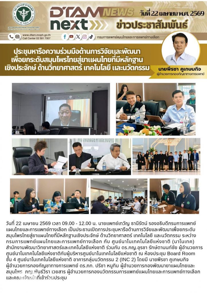 วันที่ 22 เมษายน 2569 เวลา 09.00 – 12.00 น. นายแพทย์เทวัญ ธานีรัตน์ รองอธิบดีกรมการแพทย์แผนไทยและการแพทย์ทางเลือก เป็นประธานเปิดการประชุมหารือด้านการวิจัยและพัฒนาเพื่อยกระดับสมุนไพรสู่ยาแผนไทยที่มีหลักฐานเชิงประจักษ์ ด้านวิทยาศาสตร์ เทคโนโลยี และนวัตกรรม ระหว่างกรมการแพทย์แผนไทยและการแพทย์ทางเลือกกับ ศูนย์นาโนเทคโนโลยีแห่งชาติ (นาโนเทค) สำนักงานพัฒนาวิทยาศาสตร์และเทคโนโลยีแห่งชาติ ณ ห้องประชุม Board Room ชั้น 4 ศูนย์นาโนเทคโนโลยีแห่งชาติ อาคารกลุ่มนวัตกรรม 2 (INC 2)