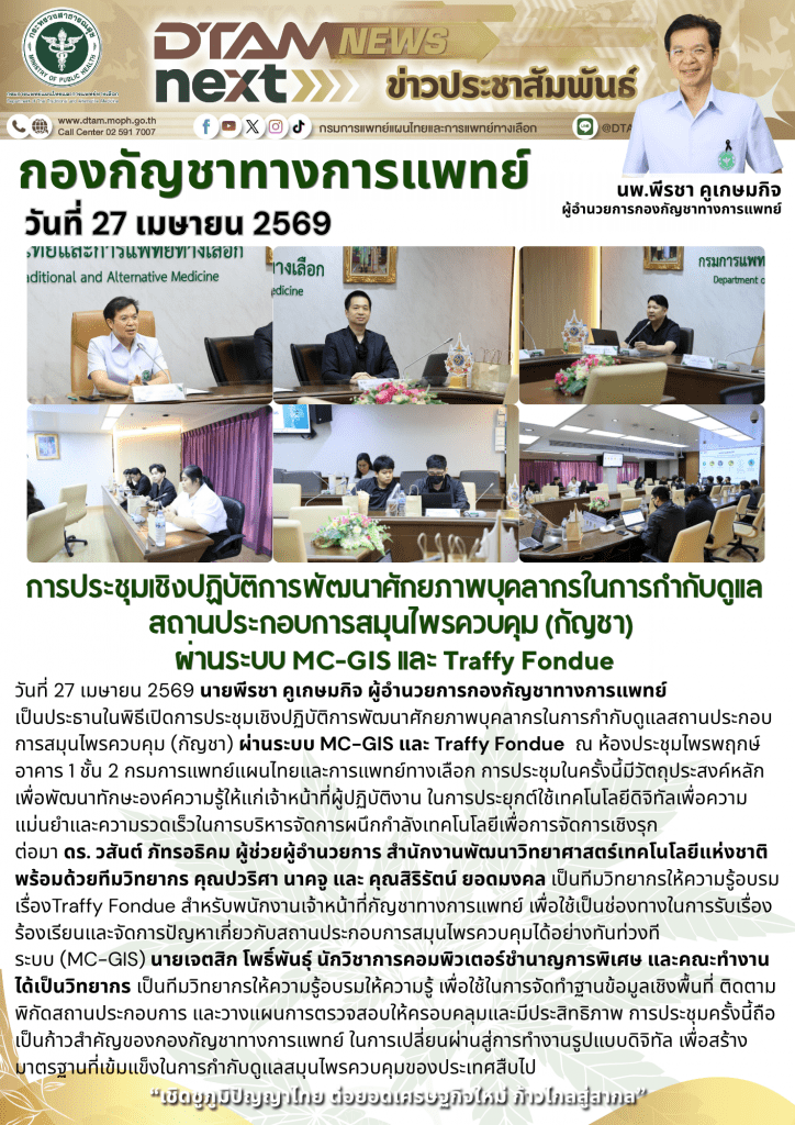 วันที่ 27 เมษายน 2569 นายพีรชา คูเกษมกิจ ผู้อำนวยการกองกัญชาทางการแพทย์ เป็นประธานในพิธีเปิดการประชุมเชิงปฏิบัติการพัฒนาศักยภาพบุคลากรในการกำกับดูแลสถานประกอบการสมุนไพรควบคุม (กัญชา) ผ่านระบบ MC-GIS และ Traffy Fondue ณ ห้องประชุมไพรพฤกษ์ อาคาร 1 ชั้น 2 กรมการแพทย์แผนไทยและการแพทย์ทางเลือก การประชุมในครั้งนี้มีวัตถุประสงค์หลักเพื่อพัฒนาทักษะองค์ความรู้ให้แก่เจ้าหน้าที่ผู้ปฏิบัติงาน ในการประยุกต์ใช้เทคโนโลยีดิจิทัลเพื่อความแม่นยำและความรวดเร็วในการบริหารจัดการผนึกกำลังเทคโนโลยีเพื่อการจัดการเชิงรุก